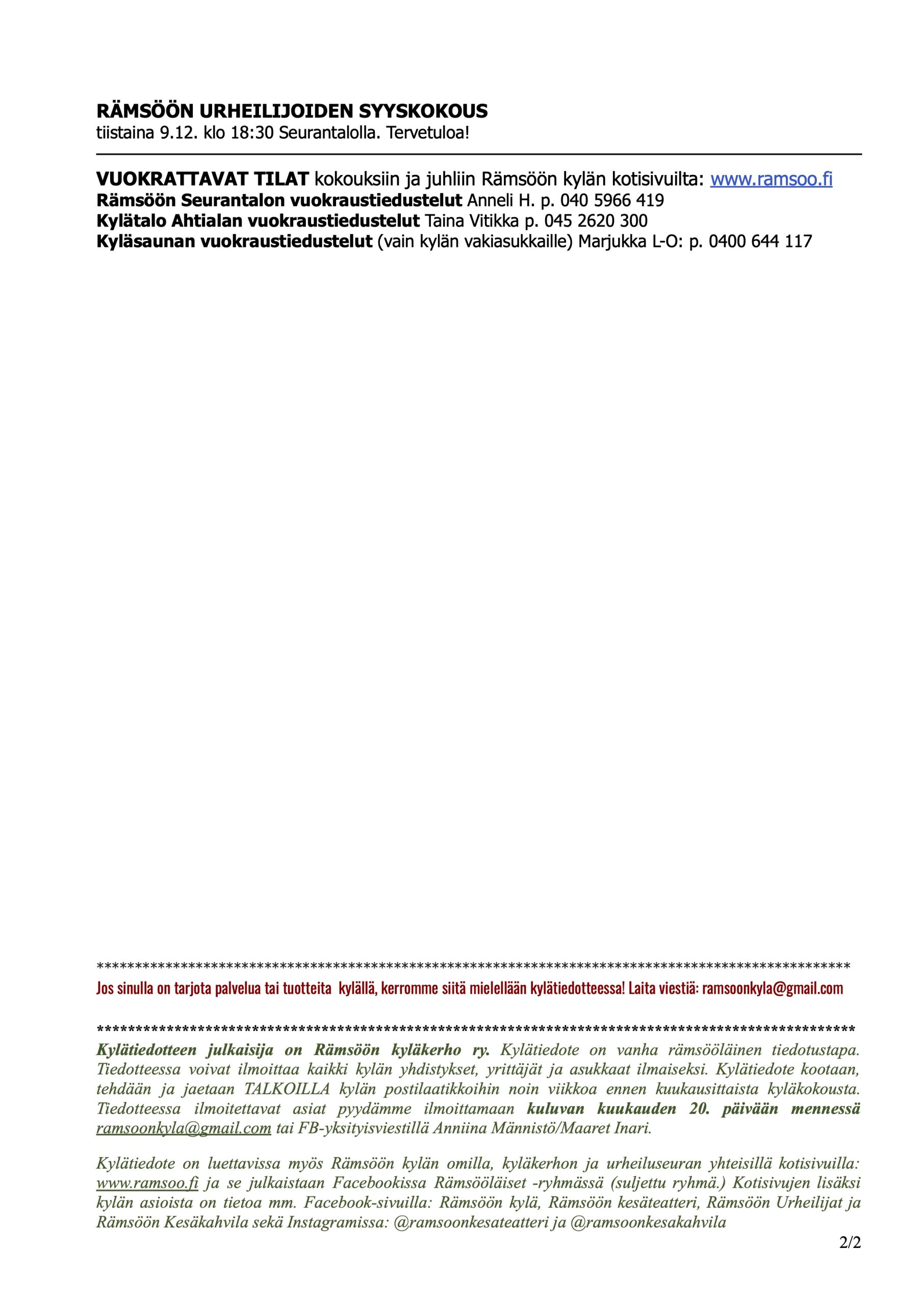 Pyydämme ilmoittamaan palveluista ja vuokrattavista laitteista ym. ramsoo(a)ramsoo.fi tai p. 0400 644117