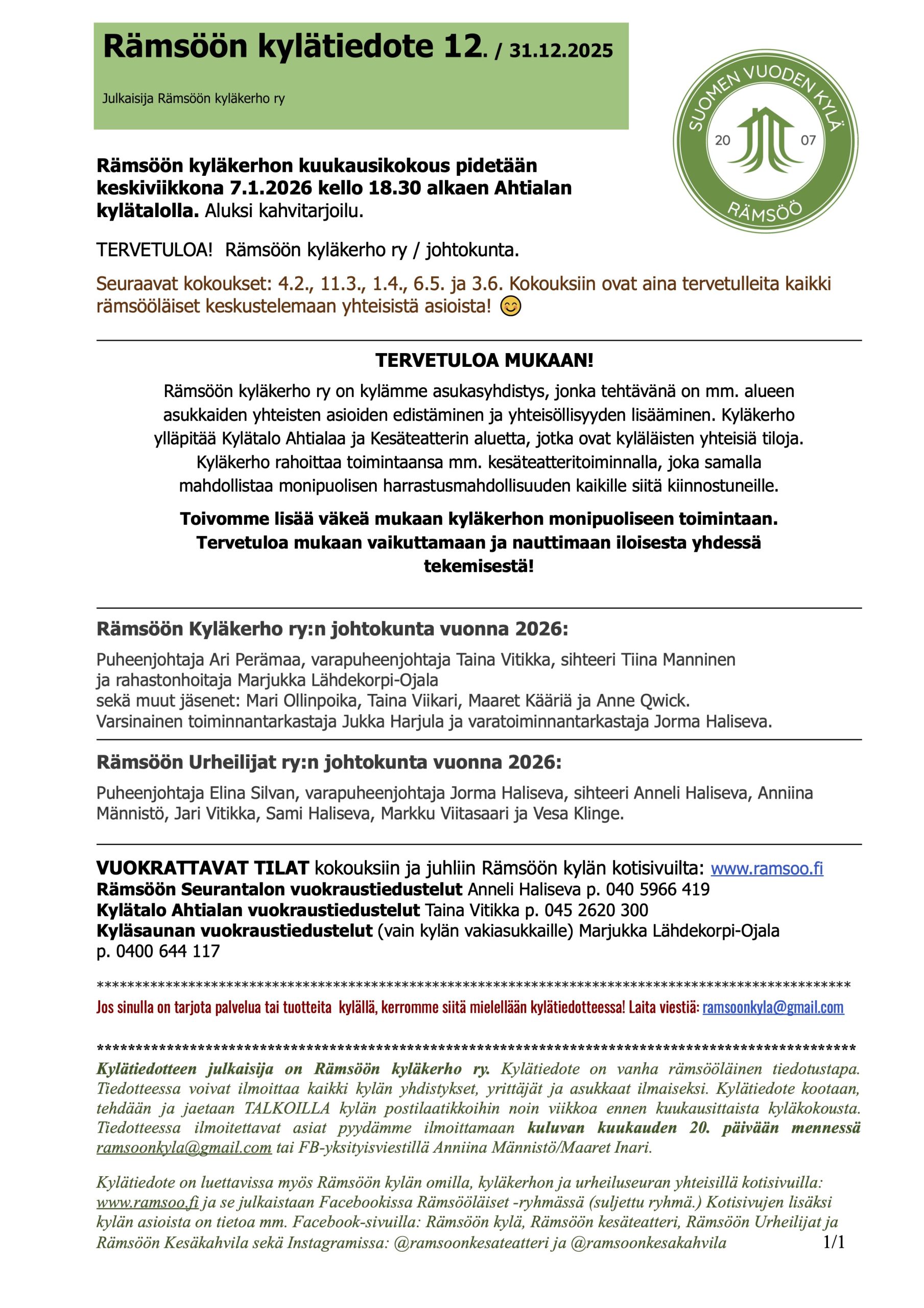 Suunnitelmissa on myös koota keväällä kylätiedotteeseen kaivattua tietoa kylän palveluista ja vuokrattavista laitteista yms. Niitä voi ilmoittaa sihteerille ramsoo@ramsoo.fi tai p. 0400 644117.